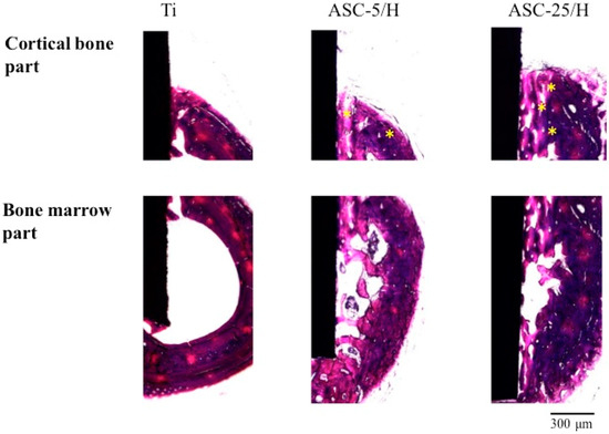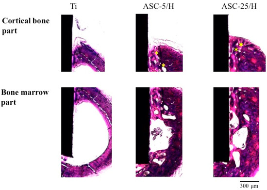 Histological appearances of Ti, ASC-5/H, and ASC-25/H implants two weeks after implantation. Asterisk: Haversian canal.