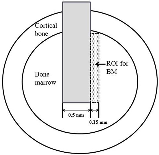 A schematic drawing of the region of interest (ROI) for quantitative analysis of histomorphometrical measurements, bone-to-implant contact (BIC), and bone mass (BM).