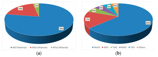 (a) Percentage of MS2 (in blue), MSe2 (in red) and MTe2 (in green) manuscripts; and (b) chart reporting the percentage of most common transition metals investigated as TMDs. (source SCOPUS, Elsevier B.V.: Amsterdam, The Netherlands).