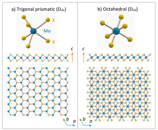 Within a single monolayer, TMDs can exhibit only two polymorphs, directly related to metal coordination: trigonal prismatic (D3h point group) or octahedral (D3d point group), with a preferred structure depending on the specific combination of chalcogen and transition metal (Figure 3). Taken by themselves, these monolayers could be also named as 1H and 1T polymorphs, respectively, where “T” stands for trigonal and “H” stands for hexagonal. The digit refers to the number stacking layers (one in the case of a monolayer), which is also the number of X-M-X units forming the unit cell [7].
