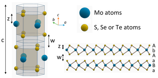 A generic MoX2 unit cell in 2H polymorph is displayed in Figure 4. A molybdenum atom plane is between two chalcogen planes, forming a monolayer. Two stacked layers are displaced respect to each other, having the metal atoms of the first layer directly above (along c-axis) the chalcogenides atoms of the second one, and vice versa. As previously described, layers are kept together by Van der Waals forces. The electronic structure of TMDs strongly depends on the coordination of the transition metal and the number of electrons in the d-orbital: for trigonal coordinated molybdenum, orbitals are fully occupied and Mo-dichalcogenides materials are thus semiconductors. Chalcogenides atoms, instead, have a minor effect on electronic properties. Lattice parameters increase with the increase of atomic number of the chalcogen, making the unit cell bigger, as reported in Table 1. At the same time, we can observe a gradual reduction of the indirect bandgap, for instance, due to the broadening of d-bands [20].