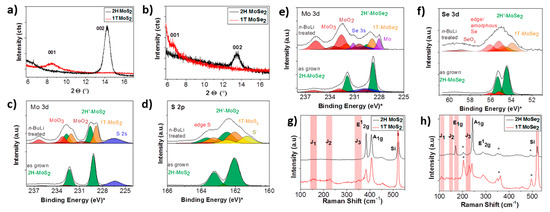 XRD pattern of: 1T and 2H MoS2 (a); and MoSe2 (b). XPS results for: Mo 3d (c); and S 2p (d) peaks of pure 2H and Li-intercalated MoS2. XPS results for: Mo 3d (e); and S 2p (f) peaks of pure 2H and Li-intercalated MoSe2. Raman spectra of: 1T and 2H MoS2 (g); and MoSe2 (h). Reprinted (adapted) with permission from [28]. Copyright (2016) American Chemical Society: Washington, DC, USA. .