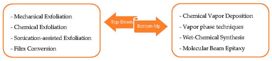 The chemical composition, phase structure, crystal quality, number of layers and edge morphologies have a strong effect on the performances of molybdenum dichalcogenides. However, the requirements depend on the proposed application: for high-end electronic devices it is necessary to fabricate high-purity and dopant-free materials, while for solar industry manufacturing cost is a key feature, and thus it is acceptable to have a certain amount of defects in the material [31]. Chemical sensing performances, in particular, are strongly affected by the synthesis technique used and the fabrication history of the samples. Across the years, many techniques have been developed for the fabrication of bulk and 2D thin film TMDs materials, which can be classified mainly as top-down and bottom-up approaches (Figure 6).