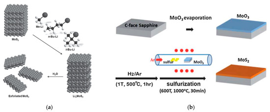 (a) Liquid exfoliation of MoS2 by using three different compounds: methyl lithium, n-butyl lithium and tert-butyl lithium. Reprinted with permission from [37]. Copyright (2015) Wiley-VCH Verlag GmbH: Hoboken, NJ, USA; (b) Schematic of conversion process from MoO3 layer to MoS2. Reprinted with permission from [41]. Copyright (2012) The Royal Society of Chemistry: London, UK.