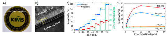 (a) Image of MoS2 semi-transparent film on the 2” sapphire substrate; (b) Cross-sectional Transmission Electron Microscopy (TEM) images, demonstrating that the synthesized MoS2 films consisted of three layers of MoS2; (c) Transient NO2 gas response at 1.5 to 50 ppm concentration, at operating temperatures of RT and 100 °C. The recovery rate was faster at 100 °C than at RT; (d) Comparison of responses to NO2 and NH3. Reprinted with permission from [58]. Copyright (2015) Nature Publishing Group: London, UK.