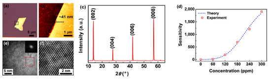 (a) Optical image; (b) Atomic Force Microscopy (AFM) image; (c) XRD pattern; (e) Fast Fourier Transform (FFT); and (f) inverse FFT image of CVD-grown multilayer MoSe2 flake. The thickness of the MoSe2 flake is about 41 nm. (d) Sensitivity vs. NO2 concentration, where the dashed blue line is based on a model, and the red square symbols represent the data from the experiments. Reprinted with permission from [89]. Copyright 2017 Springer-Verlag: Berlin/Heidelberg, Germany.