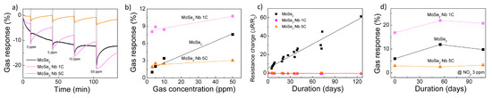 Although functionalization of TMDs materials is quite challenging due to their intrinsic nature, Choi et al. were successful in doping MoSe2 with Nb atoms [92]. They fabricated Nb-doped MoSe2 conductometric devices on sapphire substrates by a combination of different techniques for NO2 gas sensing. Firstly, MoO3 thin film (3 nm) was deposited by thermal evaporation, followed by one or five plasma enhanced atomic layer deposition cycles of Nb2O5 (PEALD) on top of MoO3 layer, with a thickness of 0.8 nm and 1.6 nm, respectively. Thermal selenization was carried out by film conversion technique similar to the one described in [41]. Niobium doping resulted in a significant decrease of electrical resistance, up to four order of magnitude, due to the metallic characteristics of NbSe2 [93]: five-cycle Nb samples experienced a doping-induced semiconductor-metal transition. Different from previous works, measurements were carried out at 150 °C in both N2 and air, confirming the p-type behavior of the material. Slightly doped MoSe2 was able to achieve the highest response (∆R/R), however all devices suffered a significant drift of the baselines (Figure 13a,b). Interestingly, the authors took in consideration the stability of the device over time. After a period of 4 months, Nb-doped devices exhibited small electrical resistance changes. On the contrary, pure MoSe2 devices suffered from a strong oxidation that resulted in a 60% change of resistance (Figure 13c). The response to NO2 was affected similarly (Figure 13d), confirming the enhancement of Nb-doping not only on the sensitivity but also on the stability of the devices.