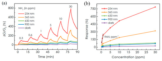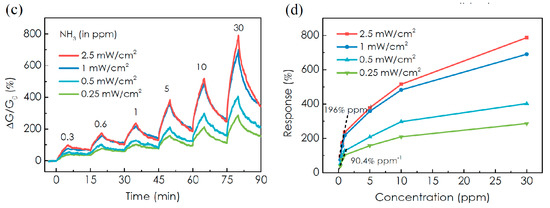 The response of the MoTe2 sensor toward NH3 is enhanced remarkably under light illumination from near-infrared (900 nm) to UV region (254 nm), keeping the same light intensity (2.5 mW/cm2), as reported in Figure 15a,b. Even though MoTe2 has a small bandgap compatible with near-infrared energy, 254 nm UV light is the most effective in enhancing the response of the FET device. In particular, it ranges from 4% (300 ppb) to 25% (30 ppm) under dark condition, whereas it range from 100% to 790% under UV light, 50 times higher than dark response. UV illumination has the side effect of forcing a behavior change from p- to n-type, due to the removal of residual O2 molecules from MoTe2 flake. Oxygen removal is deemed the reason of enhanced response of the devices, releasing more surface active sites. UV light intensity has a similar effect: applying an intensity from 0.25 mW/cm2 to 2.5 mW/cm2 the response to 30 ppm of NH3 increases from 290% to 790% (Figure 15c,d).