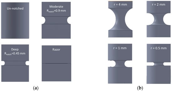 Sobieraj et al. [] examined the stress-strain behavior of neat and notched PEEK under uniaxial loads. Their notched specimens are circumferentially grooved round bars with an 8 mm outer diameter weakened by three different types of notches. These are circumferentially U-notched geometries with a 6 mm inner diameter with moderate (0.9 mm) and deep (0.45 mm) notch radii. In addition, a circumferentially razor grooved dog-bone was investigated (Figure 1a).