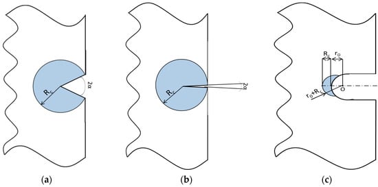 where ν is the Poisson’s ratio of the material. For a blunt V-notch or a U-notch (Figure 2c), the volume is assumed to be of a crescent shape, where Rc is the depth measured along the bisector line. The outer radius of the crescent shape is equal to Rc + r0 with r0 being the distance between the notch tip and the origin of the local coordinate system (Figure 2c). Such a distance depends on the notch-opening angle 2α and the notch root radius ρ, according to the expression: