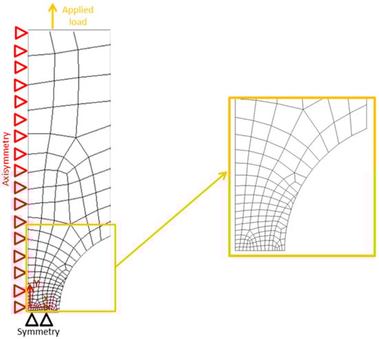 In order to obtain the SED value, axisymmetric linear elastic 2D analyses were performed on the notched models. Due to the double symmetry of the geometry, only one quarter of the specimens were modeled. The 8-nodes axisymmetric element plane 83 was selected for these analyses. A mesh convergence study was undertaken to ensure that a proper number of elements was used in FE modelling, with elements size at the crack tip ranging from about 10−3 mm to 10−1 mm. The results are independent from the mesh being the difference is only 0.11% between the SED value for a coarse mesh and that for a fine mesh (Figure 3), and thus a coarse mesh was adopted for the analyses. The mesh-insensitivity of the SED approach was previously reported also by Berto and Lazzarin [] for cracked and notched specimens. This represents one of the main advantages of this approach, together with the capability of assessing the tensile behavior of different materials regardless of the geometry. In fact, FE codes could also be used for determining the tensile strength of different components with the stress-strain curve of the un-notched material as the only input. In this case, however, the results are extremely dependent on the mesh, thus requiring high computational efforts and time for achieving reliable results. We hence aim to provide a solution to this challenge that is independent from the mesh and easy to compute.