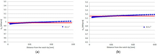 where r and θ is the radial and angular coordinate of a polar coordinate system centered at the notch tip, σθθ is the stress component according to the coordinate system and λI is the William’s eigenvalue []. Applying the tensile strength obtained experimentally from the razor specimen, for which λI is equal to 0.5, the fracture toughness was estimated as 4.99 and 5.16 MPa√m for a strain rate of 0.1 and 0.5 s−1, respectively (Figure 5). The increment of the fracture toughness increasing the strain rate was also observed in reference [].