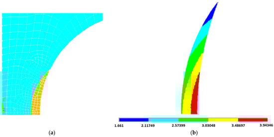 Control volume (yellow) in the axisymmetric specimen machined with a notch radius of 4 mm (a) and contour plot of the SED (in MJ/mm3) distribution within the control volume in the specimen weakened by a notch radius of 4 mm (b).