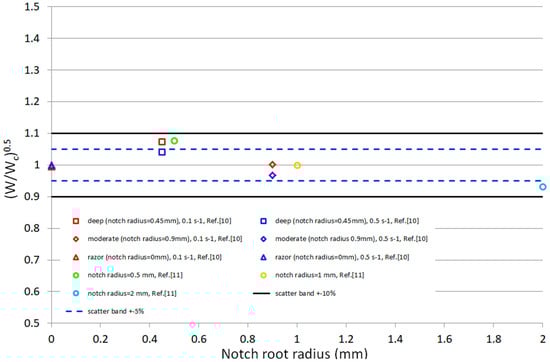 To benchmark the choice of the considered control volume, we plotted the square root of dimensionless strain energy density (W/Wc)0.5 as a function of the notch root radius (Figure 7). It appears proportional to the fracture loads of the tested notched samples; the control volume is hence appropriate with respect to various notch tip radii effects, environmental conditions and strain rates. The majority of fracture load predictions are well inside the scatter band of ±10% with a considerable number of predicted data within ±5%. This is well in the performance range with many studies of a SED database that appeared in a recent review dealing with brittle and quasi-brittle fracture of various materials []. We hypothesize the SED’s routine is applicabile for mechanical properties prediction of PEEK in various material grades and geometrical configurations with excellent predictive power.