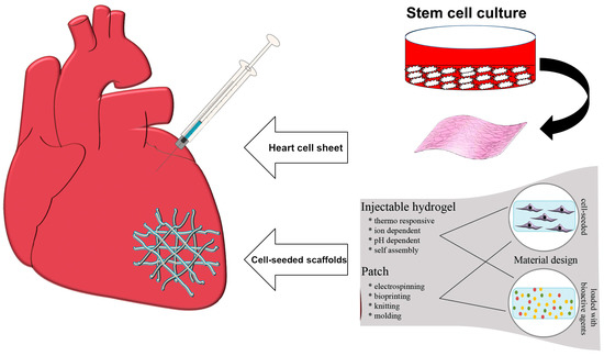 Myocardial Infarction (MI), commonly known as a heart attack, is one of the most common cardiovascular disorders resulting in many deaths globally every year [60]. This disorder is caused by the blockage of the coronary arteries supplying the myocardium. The irreversible necrosis of heart muscle is the result of MI which needs to be repaired [61]. It has been previously identified that the human cardiomyocytes could not regenerate the damaged sites after MI [62]. Therefore, tissue engineering-based constructs such as injectable scaffolds (e.g., hydrogels) and engineered cardiac patches are being increasingly investigated and developed as effective tools to regenerate the damaged tissue [63,64]. As depicted in Figure 2, cardiac tissue engineering combines isolated functional cardiomyocytes and a biodegradable or non-degradable biomaterial to repair diseased heart muscle; a comprehensive overview on the issues and challenges associated to this research topic was provided by Chen et al. [65].
