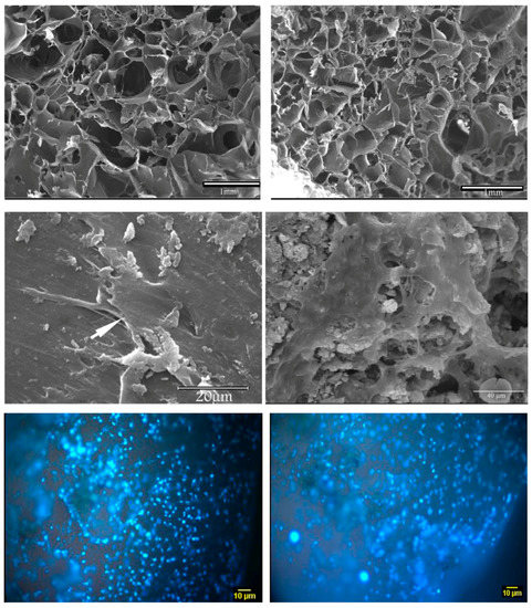 SEM micrographs of (left) gelatin/collagen scaffolds and (right) gelatin/collagen/BG scaffolds for cardiac tissue repair. Top: Pictures of bare scaffolds; middle: Cells seeded on the scaffolds; bottom: Nuclei staining of cells grown on scaffolds 15 days post cell seeding. Images from Barabadi et al. [74] © Elsevier.