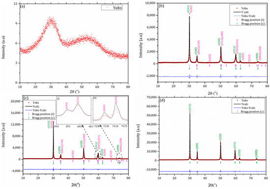 Figure 1 shows a graphical representation of the final Rietveld refinement, the experimental data and the difference between them for 7 YSZ and 8 YSZ powders. The reflections of 7 YSZ in the entire 2θ range of 20–80°, for powder calcined at 353, 973 and 1373 K for 2 h, are shown in Figure 1a–c, while those of 8 YSZ are shown in Figure 1d. Regarding the 8 YSZ composition, only single peaks of the cubic (Fm3m) phase reflections were observed for all tested calcination temperatures (the analysis for 1373 K was shown as a representative case). The reflections of the 7 YSZ composition are a combination of the tetragonal (P42/nmc) and the cubic (Fm3m) phases. The insert (i) in Figure 1c demonstrates a clear close-up at the (103) and (211) doublet, and the insert (ii) in Figure 1c shows a close up at the (004) and (220) doublet of the tetragonal phase. At 353 K, the lowest calcination temperature, the structure is quasi-amorphous, but at higher calcination temperatures of 973 and 1373 K, the structure is a mixture of the tetragonal (P42/nmc) and cubic (Fm3m) phases. Rietveld (FullProf) analysis showed that for the calcination temperatures of 973 and 1373 K, the amount of the tetragonal phase was 32% and 58%, respectively. It should be noted that no evidence of the undesired monoclinic (P21/c) phase (the low temperature stable phase of pure ZrO2) was observed.