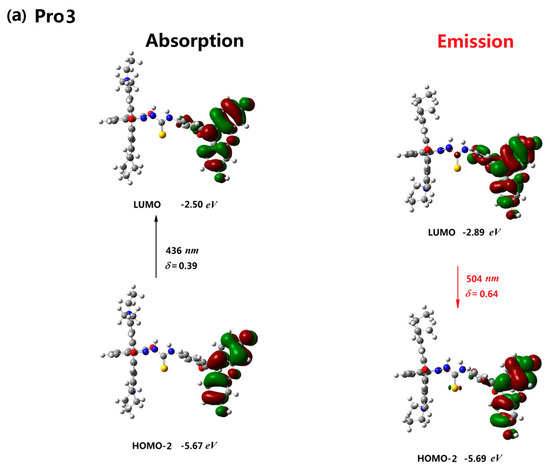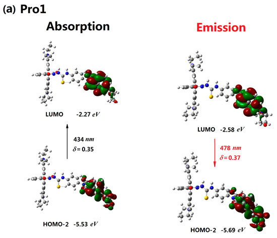 In the experiment, Pro1, Pro2 and Pro3 show featured absorption peaks at 405 nm, 501 nm and 490 nm, respectively. With the addition of Hg2+, new strong absorption peaks with wavelengths of significant redshifts were observed [21,22,23]. In the present work, we firstly study the optical absorption properties of the compounds systematically. To be specific, OPA properties of the compounds in H2O, including the excitation energies, the corresponding wavelengths, oscillator strengths and transition natures are calculated, and the results together with the experimental measurements are listed in Table 1.