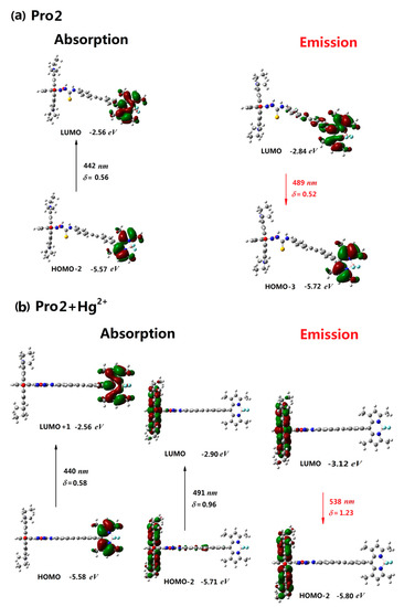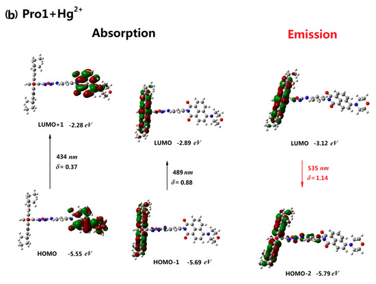 With respect to the emission of Pro1+Hg2+, it can be seen from the distributions of the molecular orbitals that the emissive process of Pro1+Hg2+ resulting from the LUMO to HOMO-2 transition is localized on the energy acceptor unit (535 nm, see Figure 3b). Based on the discussion above, we can conclude that if Pro1+Hg2+ is exposed in the light with the wavelength of 434 nm, it can be excited to a higher excited state, corresponding to an electronic transition on the energy donor moiety. However, the emission of the molecule originating from the decay from the first excited state to the ground state of the molecule is located at the energy acceptor unit with the fluorescence wavelength of 535 nm. Thus, the locations of the adsorption and emission for Pro1+Hg2+ are different, meaning that a nonradiative energy transfer process occurs. This process was named as the fluorescence resonance energy transfer (FRET), which was first proposed by Förster [36].