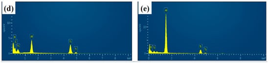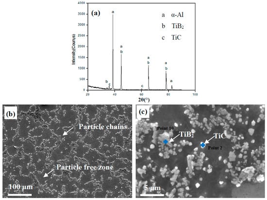The XRD pattern of the prepared Al-5 wt % TiB2/TiC in situ composites is shown in Figure 2a. The XRD pattern shows that TiB2 and TiC phases were formed in these composites. Figure 2b shows the microstructures of the composites, and many reinforcement particles can be observed in the matrix. Notice that most of the reinforcement particles are distributed along the grain boundaries, and the particle-agglomerated clusters formed long particle chains. Meanwhile, large particle-free zones formed in the interior of the grains. In the magnified image (Figure 2c), the white particles are TiC and the gray particles are TiB2 [26]. EDS experiments were also used to identify TiC and TiB2 particles, as shown in Figure 2d,e. The TiB2 and TiC particles were in the range of 0.5–2 μm, and the small-sized particles easily formed large agglomerated clusters due to their large surface-to-volume ratio and their attractive Van der Waals interactions [27].