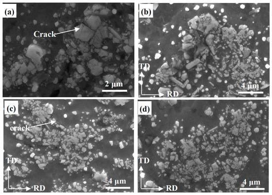 Figure 4 demonstrates the SEM micrographs of the microstructures of Al-5 wt % TiB2/TiC composites after different deformation processes at a higher magnification. As shown in Figure 4a, some cracks appeared in the large close-packed particle clusters, formed by plastic deformation during rolling. We suggest that the large particles are actually composed of multiple smaller ones, due to their attractive Van der Waals interactions reducing the total surface energy in the melt. With increased deformation after multiple ARB cycles (Figure 4b,c), the large agglomerated particle cracked and was divided into several submicro-sized ones. By increasing the ARB processing up to four cycles, the number of small particles of submicro size was increased, due to the separation of the particle clusters, and almost all the resulting particles were smaller than 1 μm. Furthermore, the distribution of reinforcement particles in the matrix became more homogenous, as shown in Figure 4d.