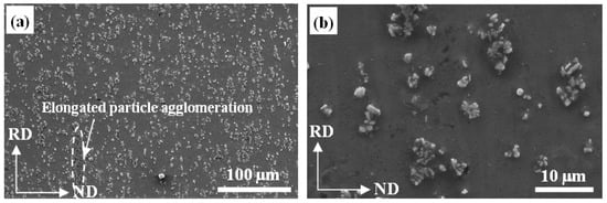 The microstructures of the Al-5 wt % TiB2/TiC composites following increasing ARB cycles in the RD-ND plane were also investigated, and are shown in Figure 5. After the first cycle (Figure 5a,b), the particle chains in the original sample almost disappeared and a few elongated agglomerated particle clusters existed along the rolling direction. In the magnified image in Figure 5b, it can be seen that the reinforcement particle clusters were broken by the stress of rolling and most of them separated from each other. With increasing ARB cycles, the distribution of particles in the matrix became much more uniform as shown by Figure 5c,d. As the ARB process progressed up to four cycles, a microstructure with uniformly distributed TiB2 and TiC reinforcement particles was obtained (Figure 5e,f). This phenomenon is attributed to the high deformability of the Al matrix under the stress of rolling. Furthermore, compared with Figure 3 and Figure 4, the microstructure shows that the uniformity of the RD-ND plane was much better that of the RD-TD plane [28].