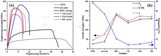 The typical engineering stress-strain curves of different Al-TiB2/TiC composites and commercial pure Al (CPAl) are shown in Figure 8a. Compared with commercial pure Al, the tensile strength of the in situ Al-TiB2/TiC composite was enhanced greatly by the reinforcement particles. Meanwhile, the composites with 90% reduction rolling and after subsequent ARB cycles showed higher strength and lower ductility compared to the as-cast one. The composites’ variation of yield strength (σy), ultimate tensile strength (UTS), and elongation to failure (ε) under different deformation treatments, obtained from the engineering stress-strain curves, are presented in Figure 8b.