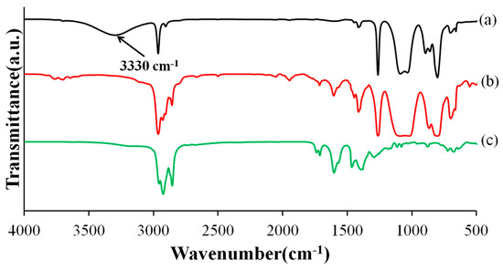In this study, an STP/DD combination was used as a healing agent. STP is a polydimethylsiloxane having silanol end groups. A polydimethylsiloxane structure was chosen because it is hydrophobic and water repellent. STP was expected to undergo condensation reaction of silanol groups in the presence of DD to give a higher molecular weight polydimethylsiloxane (Scheme 1) [15]. In IR spectra of a pristine STP and a reaction product (Figure 1), an absorption band at 3330 cm−1 due to silanol groups disappeared after the reaction of STP in the presence of DD, indicating that the condensation reaction of STP proceeded. The pristine STP is a low-viscosity liquid and turned into highly viscous or viscoelastic substances through the reaction.