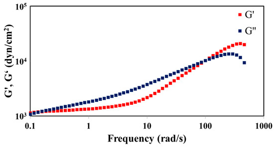 Viscoelasticity measurement of the reaction product was conducted under the conditions that temperature and strain were held constant. Figure 2 shows the data of storage modulus G’ and loss modulus G” as a function of angular frequency for a 10:1 mixture after the condensation reaction. G’ and G” increased with increasing angular frequency, and there was a crossover point at 100 rad/s. These graphs indicate that the resultant polymer shows a characteristic of viscous liquid below the crossover point frequency, and elastic contribution dominates over the frequency [16].
