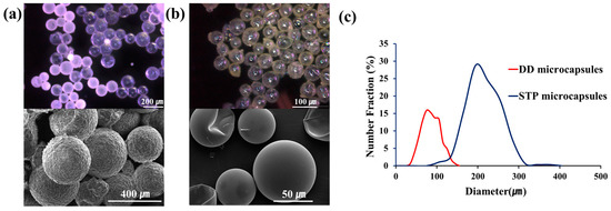 (a) Optical microscope (top) and SEM images (bottom) of the STP-containing microcapsules; (b) optical microscope (top) and SEM images (bottom) of the DD-containing microcapsules; (c) microcapsule size distribution of STP and DD microcapsules prepared at 1000 rpm.