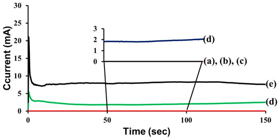 Current versus time for scratched self-healing and control coatings: (a) STP/DD-based coating before vibration; (b) MTP-based coating before vibration; (c) STP/DD-based coating after vibration; (d) MTP-based coating after vibration; and (e) control coating.