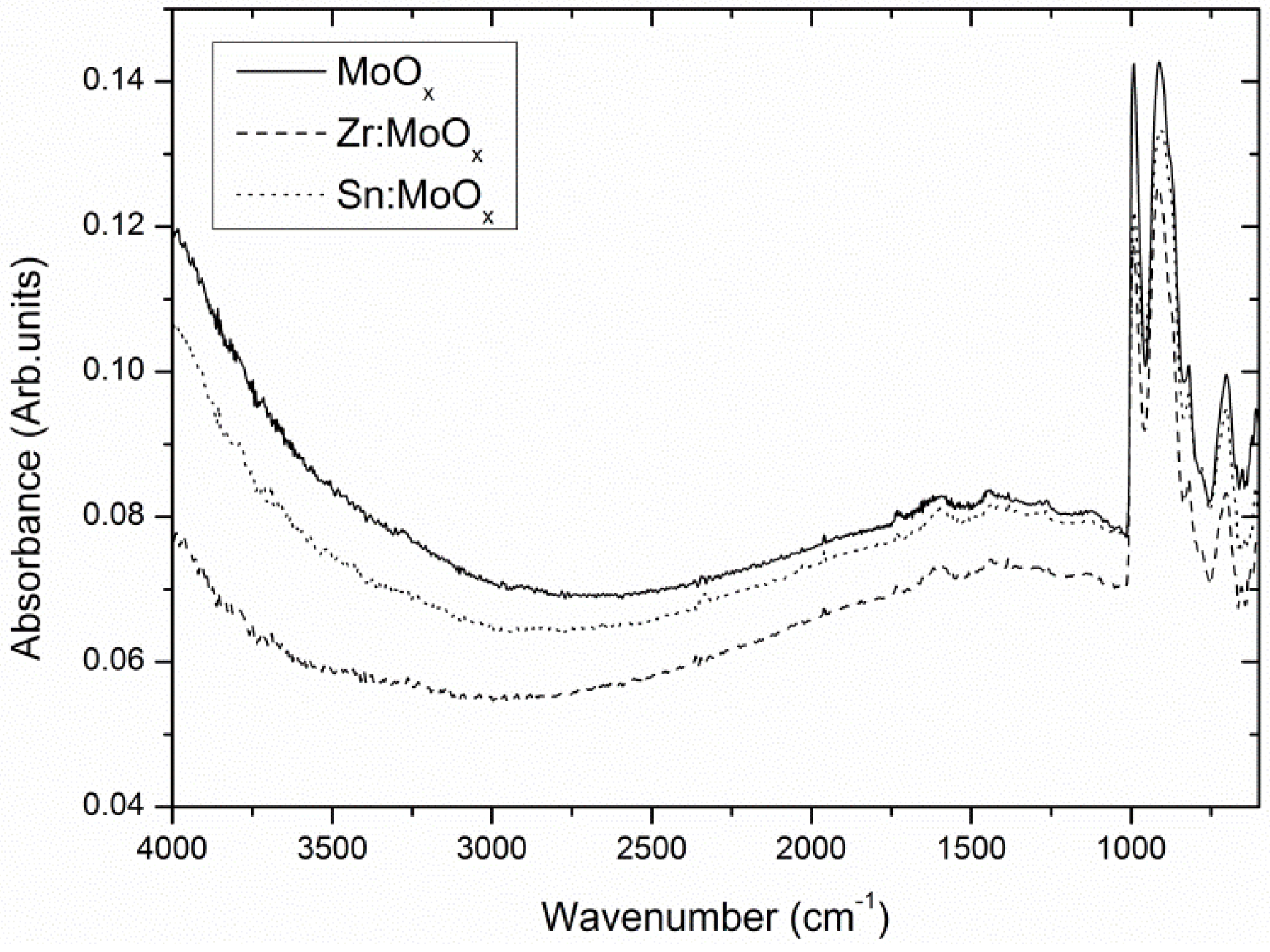 To investigate the influence of the presence of zirconium and tin inside MoOx HTLs in organic photovoltaics, Zr- and Sn-containing molybdenum oxide films were compared to unmodified MoOx films via complementary analysis techniques. Thermogravimetric analysis (TGA) results obtained on dried fine powders (grain size <63 µm) show a very similar decomposition process for all three precursor systems (Figure S2). Hence, all spin coated layers received an identical thermal treatment. The chemical structure of the unmodified Sn-containing and Zr-containing molybdenum oxide layer was evaluated by grazing incidence attenuated total reflection Fourier transform infrared spectroscopy (GATR-FTIR). Figure 1 shows the infrared spectra of spin-coated layers on ITO substrates. All films received an identical thermal treatment up to 300 °C. The small absorbance signals at 1445 cm−1, 1593 cm−1, and 1733 cm−1 indicate a minor residual organic fraction originating from the acetylacetonate salts used in the precursor system. However, the most distinct signals in all spectra can be appointed to characteristic Mo-O vibrations: 995 cm−1 (O-Mo stretch), 902 cm−1, and the shoulder at 822 cm−1 (both corresponding to a Mo-O-Mo stretch) can be identified. The shape of the bands strongly resembles the o-MoO3 spectrum reported by Seguin et al. [40]. The signal at 696 cm−1 is deviating from the reported values. This comes as no surprise, as the infrared spectra of MoO3 are known to be dependent on the morphology of the crystallites [40] and the so-called transverse optic and longitudinal optic (TO-LO) splittings [41]. This result suggests that the processed MoOx layers are very similar to stoichiometric MoO3, although the MoOx notation will be conserved throughout the article. Nonetheless, all spectra show strong similarities, suggesting that the additives have a negligible influence on the molybdenum oxide composition and chemical structure.