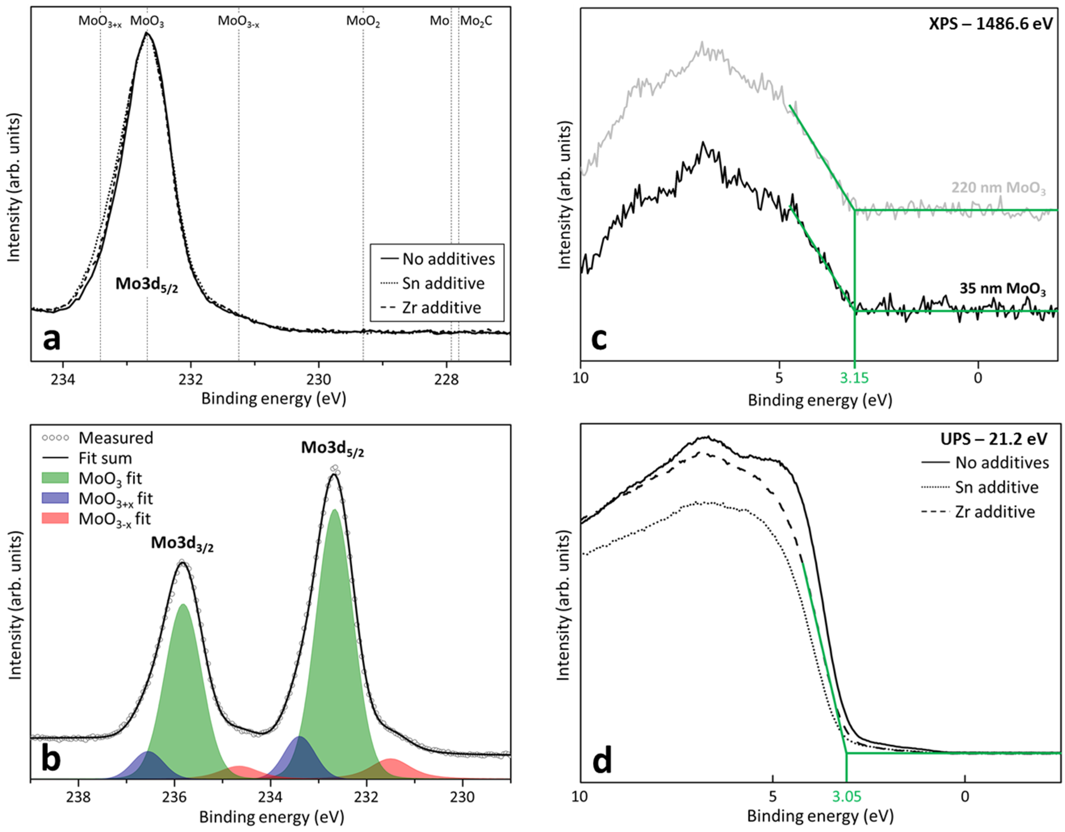 (Top left: 2a) X-ray photoelectron spectroscopy (XPS) measurements of unmodified, Zr-containing and Sn-containing molybdenum oxide layers. The MoOx region label indicates a region in which Mo(V) and Mo(IV) can occur simultaneously as impurities in the MoO3 matrix; (Bottom left: 2b) XPS fits of the relevant present Mo species, demonstrating the occurrence of the MoO3-x sub-oxide, MoO3 being the dominant species and charging or molybdenum vacancies; XPS (top right: 2c) and UPS (bottom right: 2d) determination of the valence band edge of unmodified and Zr- and Sn-containing MoOx. Figure 2b only contains a single XPS plot, as both the unmodified and additive-containing XPS measurements overlapped perfectly.
