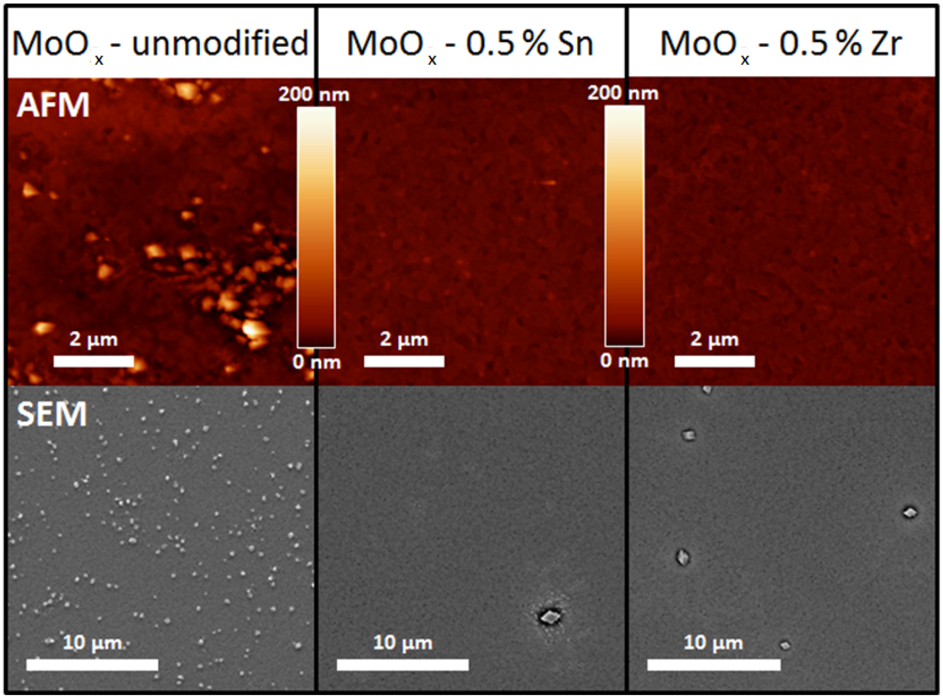 The morphological changes are more clearly visualized by AFM and SEM. The most representative results are shown in Figure 3, and a complete presentation of the SEM images is provided in Figure S6. Detailed analysis of the images reveals the cause of the increased roughness for the unmodified MoOx samples compared to the Sn- or Zr-modified oxide layers. On the surface, a varying amount of small grains is visible. The surface density of these grains is much higher for the unmodified MoOx layer. On the Zr- and Sn-containing layers, however, the presence of the grains diminishes notably. Combining these observations with the AFM results in Table 1, it is evident that the presence of these grains gives rise to the increased RMS roughness. Thus, the addition of zirconium and tin additives to the molybdenum combustion precursor influences the morphology of the resulting layers in a beneficial way by reducing the occurrence of grains on the surface. Moreover, a zoomed in image of a crystallite-containing region is presented in Figure S7. Aside from the presence of crystallites, the image demonstrates that parts of the surface remain uncovered, accounting for the indium peaks observed in XPS.