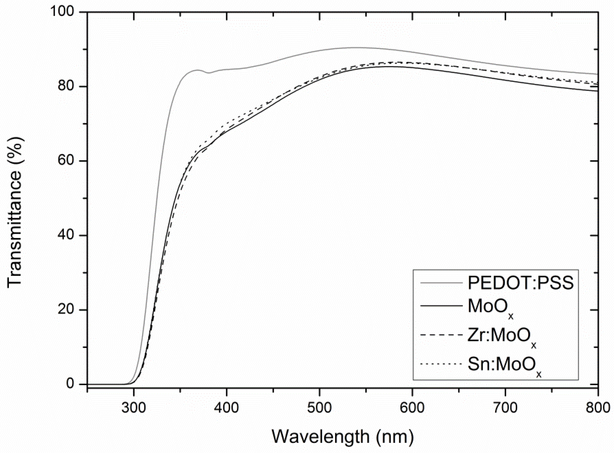Finally, the transparency of the layers was evaluated by UV-Vis spectroscopy. As XPS results proved that the additives do not have a significant effect on the bandgap of the HTLs, only roughness-related effects (e.g., light scattering) can justify differences in the spectra. Moreover, phase segregation resulting in ZrO2 and SnO2 is not expected to affect the transmission, as both materials exhibit a large band gap and high transparency in the visible spectrum [15,50]. From Figure 5, it becomes clear that the solution-processed molybdenum oxide layers underperform compared to 35 nm PEDOT:PSS reference layers (HTL in traditional organic electronic devices) for this particular device stack. The spin coating of a PEDOT:PSS layer with comparable thickness was achieved via an optimization as a function of spin speed, whereupon the thickness was determined via profilometry (Figure S10). Differences between the unmodified and Zr- or Sn-containing molybdenum oxide layers are miniscule: a maximum effect can be noticed in the high wavelength range of the UV-Vis scan.