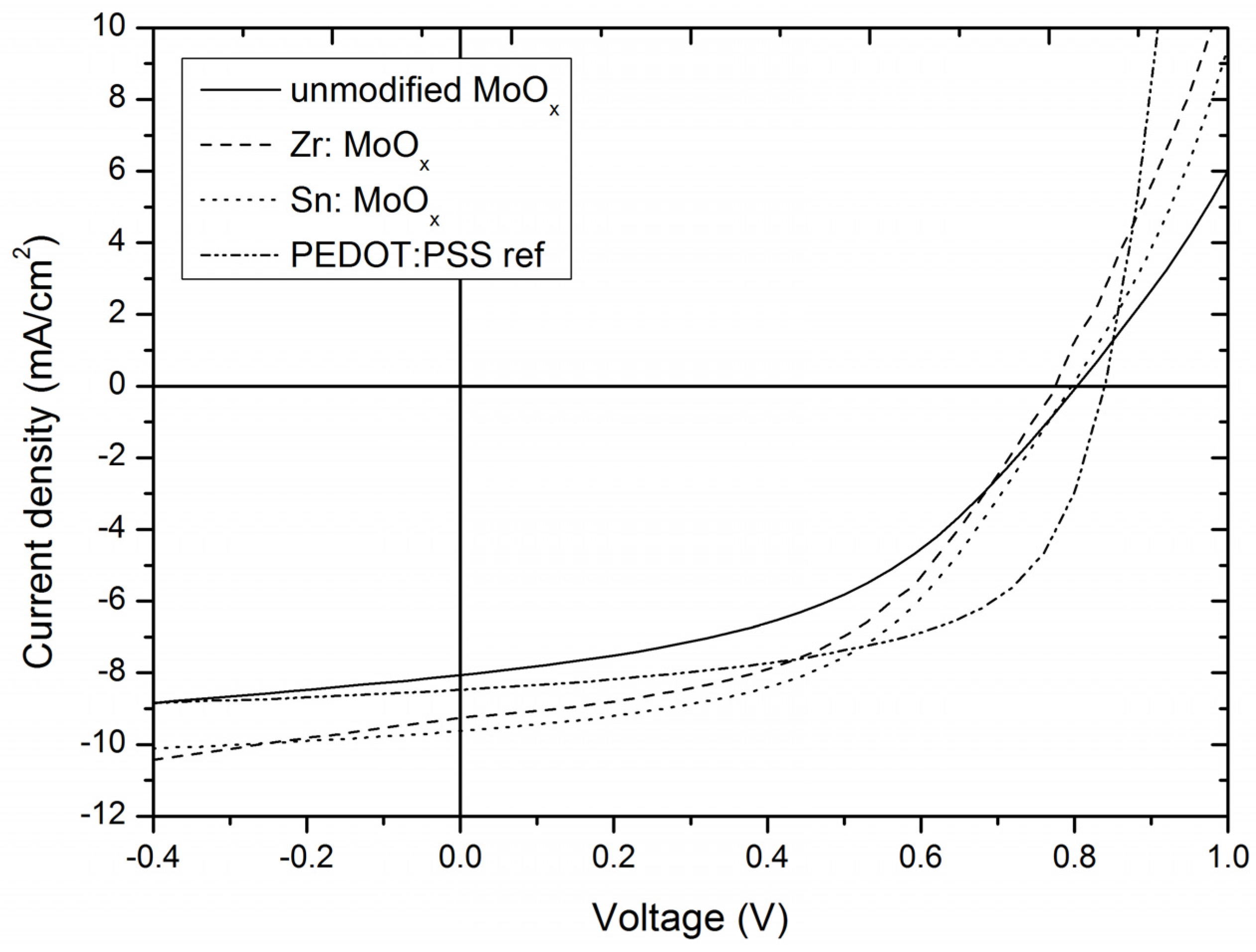 Average J–V curves illustrating the increase in Jsc for the devices incorporating Sn- and Zr-containing layers compared devices with an unmodified MoO3 HTL.