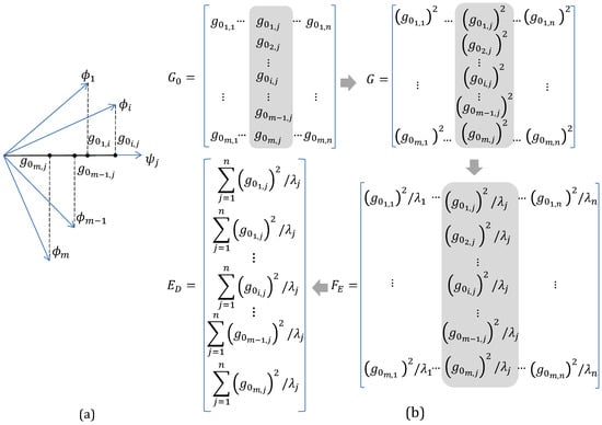 Postmultiplying matrix by matrix Ψ results in a matrix (Equation (8)) in which the jth column vector contains the orthogonal projection of each row vector of on the jth eigenvector (column vector) in Ψ such that the ith component of this vector contains the projection of the ith row vector from (Figure 2a),