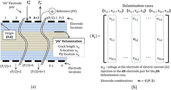 The 2D finite element model is used to analyze the composite laminate with embedded delamination for a given current path due to an electrode combination (where current is injected) and obtain the resulting voltage distribution. Figure 3a shows a schematic exemplifying the composite laminate with P electrodes, where the electrical current is injected between electrodes h and forming the ith pair. For a laminate with specified properties and P electrodes evenly distributed on both the top and bottom surfaces (Figure 3a), electric current is applied on all possible electrode pair combinations. The number of combinations m of choosing two electrodes from P electrodes equals the combinatorial coefficient . The finite element analyses are repeated for n different damage cases. For each case, the obtained voltage is the electric potential difference between the electrode pair used for electric current injection. Therefore, m electric potential values are computed for each damage case forming a column vector of matrix .