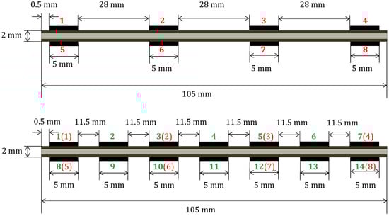 Laminate and electrode model used for the finite element analyses. Case of laminate with eight electrodes (top) and 14 electrodes (bottom). Numbering for eight electrodes (red) and 16 electrodes (green) with its 8-electrode equivalence in parentheses.