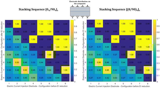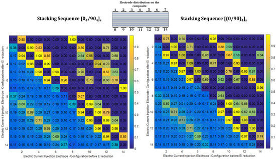 Figure 5 and Figure 6 present heatmaps for graphical comparison of the EI values before and after reduction for both stacking sequences. The heatmaps were plotted using a toolbox developed for MATLAB []. The diagrams present EI values before reduction in their area below the diagonal and the EI values after reduction in the area above the diagonal. For an electrode pair, a first electrode value set on the abscissa and the second one on the ordinate gives an EI value before reduction. On the other hand, a first electrode value set on the ordinate and the second on the abscissa gives an EI value after reduction.