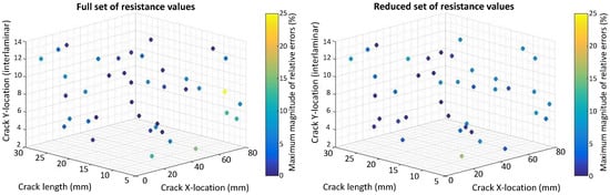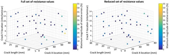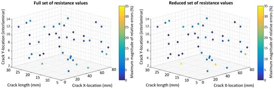 Scatter plot with maximum magnitude of relative errors obtained at the 40 test points used for inverse identification in a laminate using 14 electrodes and considering: (left) Full resistance measurement set; (right) Reduced resistance measurement set using EI.