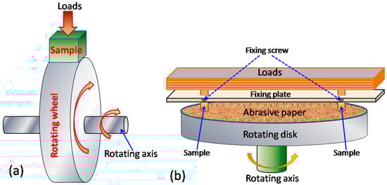Schematic illustration of (a) block-on-wheel dry sliding wear and (b) abrasive wear tester.