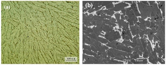 (a) Optical microscope (OM) and (b) scanning electron microscope (SEM) microscopy showing the typical microstructure morphologies of the Ni–Mo–Si ternary intermetallic composite.