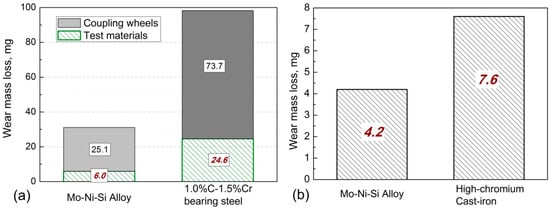 Moreover, as shown in Figure 4a, wear mass loss of the coupling hardened 0.45% C steel wheel with the intermetallic composite as a wear test material is much lower that with the reference 1.0% C–1.5% Cr bearing steel as wear test material. Tribologically, the behavior of metallic materials in wear conditions is highly dependent on the chemical affinity of decoupled wear elements. The reference steel material has the same metallic bond with the wear coupling wheel, which led to a strong chemical affinity and serious wear loss of both wear test materials and the coupling wheel. The covalent-dominant atomic bonding attributes of NiMo and Mo2Ni3Si phases in the 45Ni–40Mo–15Si ternary intermetallic composite led to poor chemical affinity with its wear steel counterpart.