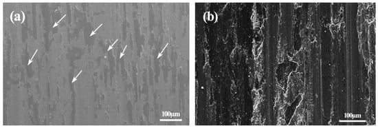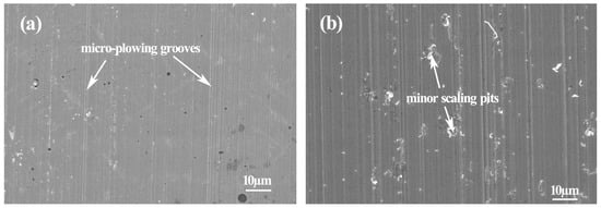 The worn surface morphologies of the intermetallic composite and high-chromium cast-iron after abrasive wear are illustrated in Figure 6. As the arrows indicate, micro-cutting and plowing grooves are observed on the worn surface of the intermetallic composite, while minor scaling areas and pits can be discovered beside plowing grooves on the worn surface of the high-chromium cast-iron (see Figure 6b).