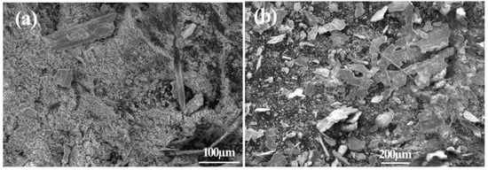The wear debris of the 45Ni–40Mo–15Si ternary intermetallic composite collected after each dry-sliding wear test displayed a size distribution from tiny powder, filament-like debris, to flake-like fragments, as shown in Figure 7a. Careful examination revealed that the filament-like debris was up to 300 µm in length, and the flake-like fragments were up to 200 µm × 70 µm in size. EDS examination revealed that the chemical composition of tiny wear powders was Fe57%Ni11%Mo7%Si4%O21%, which indicates that they are mixed metal oxides and mainly from the coupling steel wheel because of the high Fe content. The filament-like debris are cutting products from rotating steel wheel, and the flake-like fragments are an agglomeration of tiny debris powders. In comparison, wear debris of the reference hardened 1.0% C–1.5% Cr bearing steel after dry-sliding wear tests was large, as shown in Figure 7b. The wire-like wear debris was the adhesion product originating from either the block-like test sample or coupling wheel.
