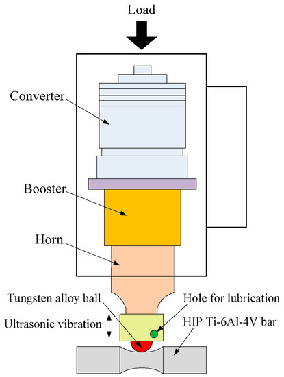 MUSR treatment was conducted on a lathe using a carbide alloy rolling ball in the conditions of lubricating and pouring cooling fluid into the hole. The processing parameters of MUSR are shown in Table 2. The HIP Ti-6Al-4V bar was ultrasonic rolled six times using the same processing parameters. The rolling direction was unidirectional, and not reciprocating. The entire treatment was carried out at room temperature. The main principle of MUSR treatment is the use of resonant impulses generated by an ultrasonic generator into the harmonic shock of a work ball with a certain amplitude, as shown in Figure 2. MUSR treatment could provide the good surface quality and uniform surface-modified layer structure. The rolled ball could reduce the friction between ball and component and avoid the ploughing phenomenon generated by the fixed ball under the high load. Moreover, the non-fixed rolling tool facilitated replacement with other different shapes of rolling tools that were used for processing the different parts.