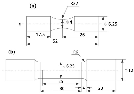 The size of an hour-glass specimen for the fatigue test was shown in Figure 3a. It had a gauge length of 16 mm and a diameter of 4 mm in the net section. Stress controlled rotary bending fatigue tests for the specimens before and after MUSR treatment were conducted using a rotary bending machine (QBWP, Changchun, China) at a cyclic frequency of 100 Hz at ambient temperature. Stress amplitude in the net section of the specimen was estimated by accounting for the balance of the inertia forces arisen at bending load [14]: