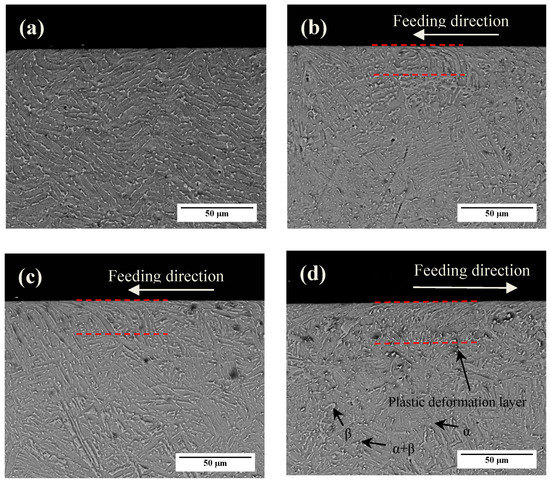 SEM photographs of the cross-section of HIP (hot isostatic pressing) Ti-6Al-4V samples before and after MUSR treatment: (a) untreated sample; (b) 30 kHz–600 N; (c) 30 kHz–750 N; (d) 30 kHz–900 N.