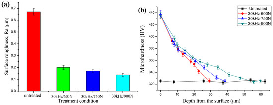 (a) Surface roughness values of the different conditions treated samples; (b) variation in microhardness of samples treated by MUSR along the depth direction from the treated surface.